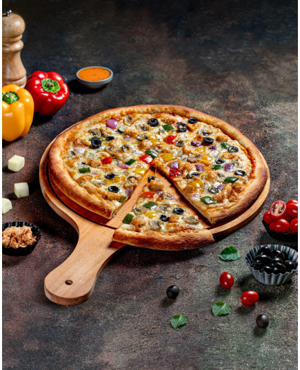 Chicken,green capcicum,Onion,Mushroom,tomato,black olives with cheese & sauce.